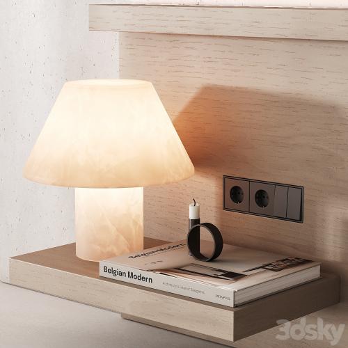 The model also has decor and filling: a bottle of water, a glass, a tray, a table lamp, a pendant lamp, sockets, switches, books and paintings, the exact names of which are indicated in the names of the object.