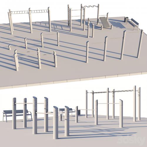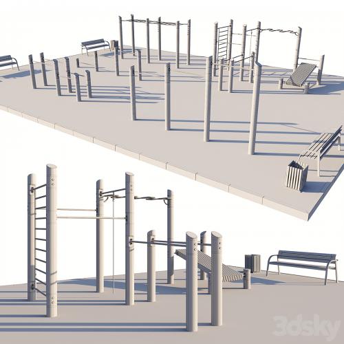 On the site there are horizontal bars of various heights, a complex with a bench for training the press, bars, etc.