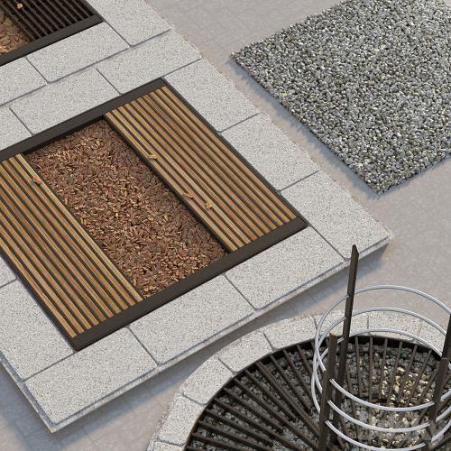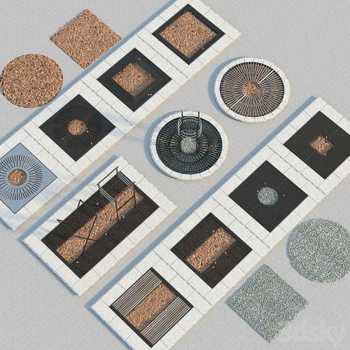 Decorative grilles for framing and protecting tree trunks. Models of chips and crushed granite are attached.
