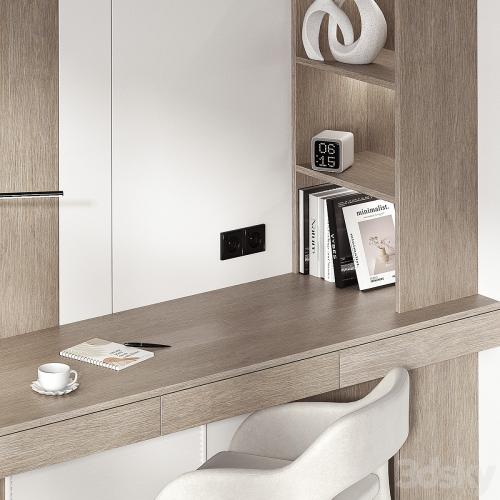 set includes hanging table, illuminated shelving unit, echo petite chair, tubs grok lamp, illuminated wall panels, electrical outlets, notebook, sketchbook, pen, coffee cup, books, clock, vases