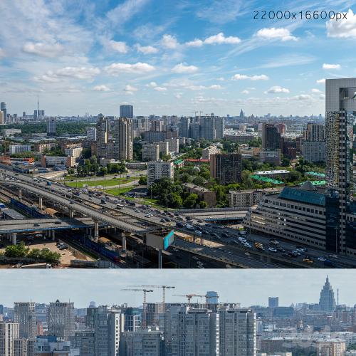 In the panorama, you can see many buildings near the Business Center, the Ostankino tower, stalinka