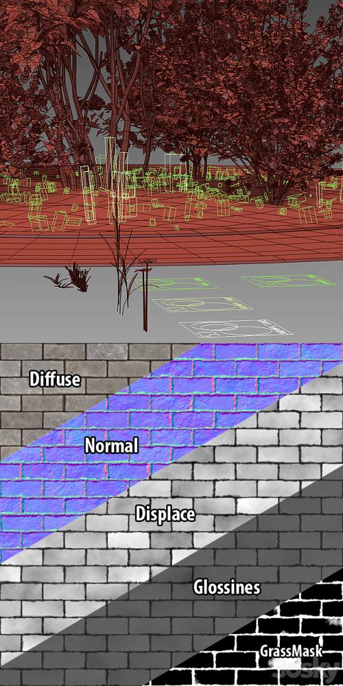 - CoronaScatter is present in the Corona version with tuned grass distribution parameters and in the gaps between the paving stones.