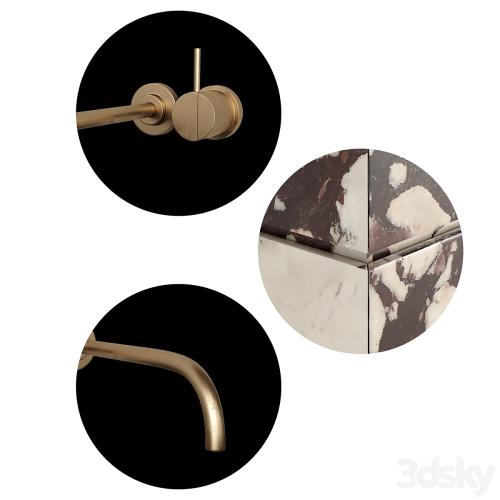 The washbasin is made of CALACATTA VIOLA marble with brushed brass taps.