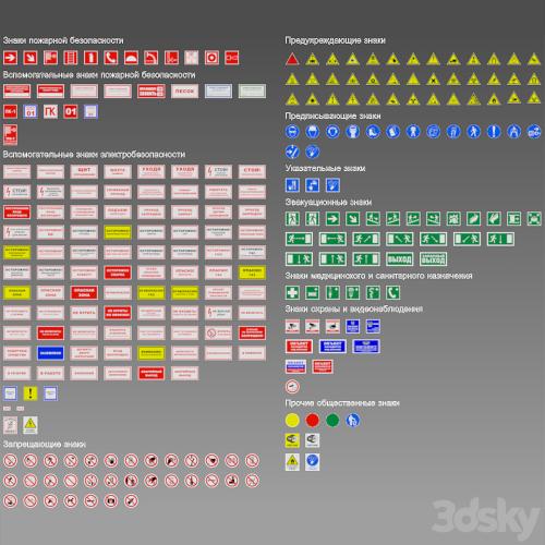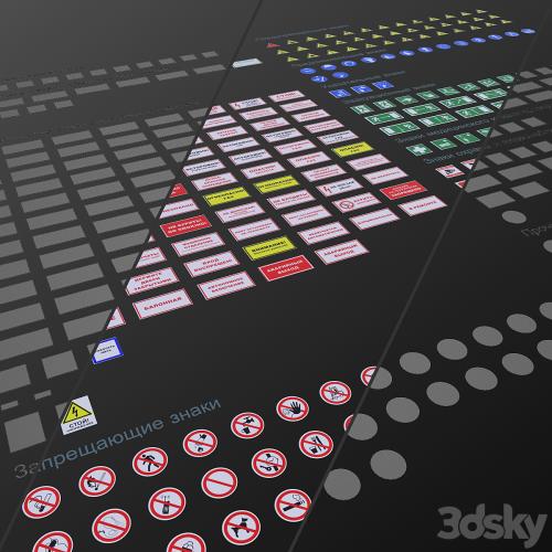 Render Corona and V-Ray Model 259 signs for emergency exits, fire signs, and everyone else. Including sign "do not enter with food", "On a skateboard not skate" and "Switch off for a light." Just building signs and all the rest. In the scene 3423 polygons 5810 points. All signs with a thickness of 5 mm Files: 3dsmax 2015 Corona. 3dsmax 2015 V-Ray. 3dsmax 2012 Corona. 3dsmax 2012 V-Ray. fbx Textures in resolution over 1200 px around.