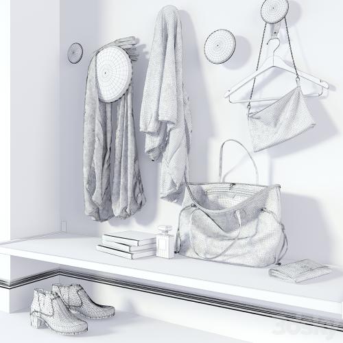 654543 polygon. The file includes: a jacket, a scarf, gloves, a clutch, books, a perfume bottle, boots, as well as a bag of Neverfull MM and a Lockme II purse from LOUIS VUITTON.