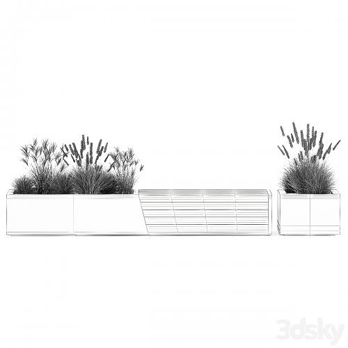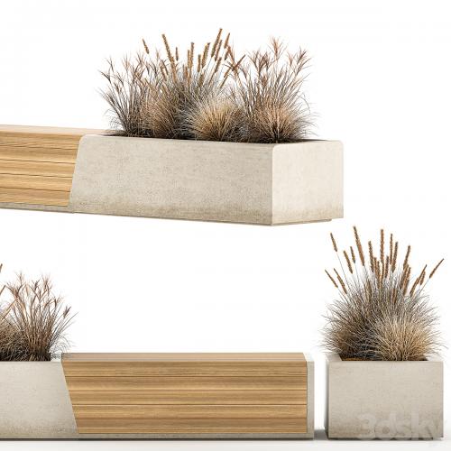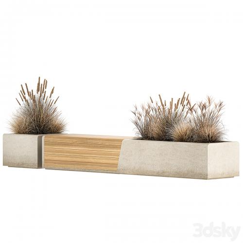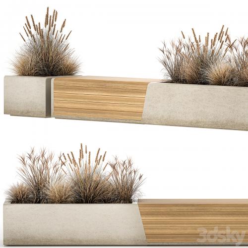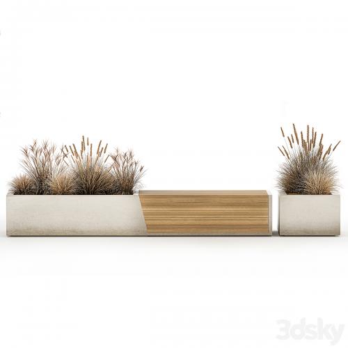 Bushes for street, public areas and shopping mall, cafe and restaurant decor. metal bench. Concrete bench.