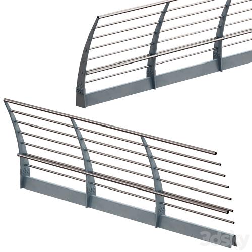 3d model of a bridge, deck fence made of metal for fencing an embankment, a bridge, a pier. Painted metal main frame, chromed steel handrails. The file contains two versions of the model, with more and fewer horizontal segments. A model with a large number of segments is convenient for bending with the Bend modifier or in another way. For large angles, you can apply the TurboSmoth modifier. The fence element is easy to replicate using Tools => Array. Specify the distance for copying 360cm.
