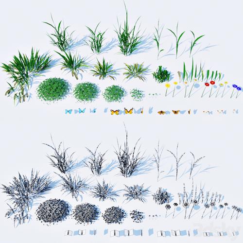 The kit for landscaping includes: - 3 groups of tall grass + source - 5 groups of low grass + source - 4 clover group + source - 5 kinds of colors - 4 species of butterflies ---------------- ----------- In the archive: 2014 and 2011, MAX (Corona and VRay) + FBX 13,954 polygon. Beautiful lawns --------------------------- you!