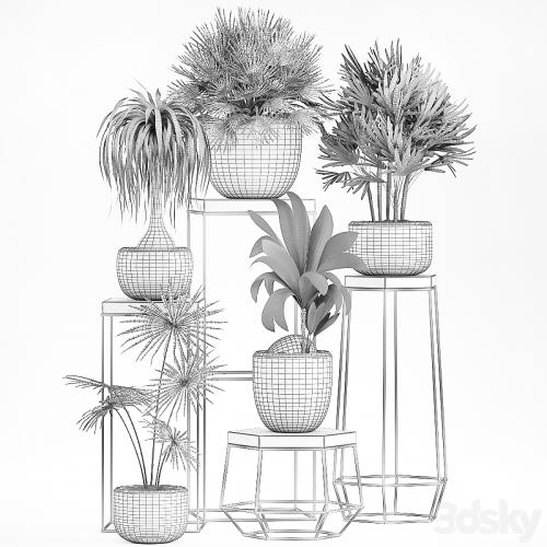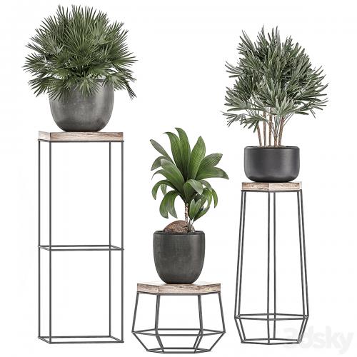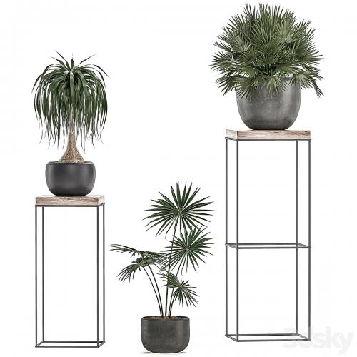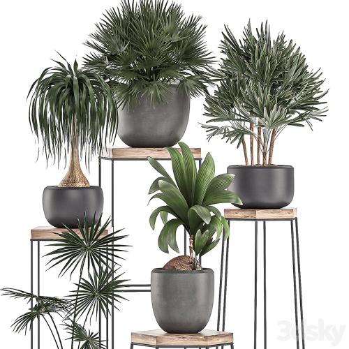 A collection of small plants in pots on stand tables with dracaena, rapeseed, palm, fan, coconut nutsifera. Set 525.