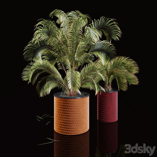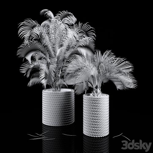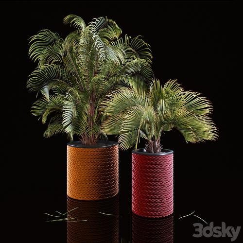 Two palm trees in woven pots.