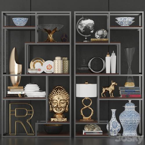 Rack with decor 7. Sculpture, figurine, gold, buddha, books, hourglass, magazine, globe