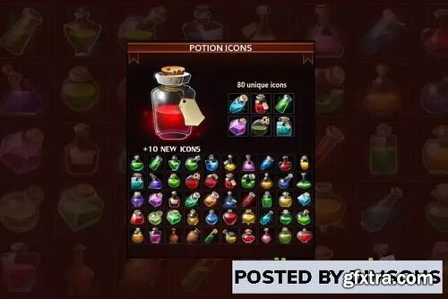 Set of 80 hand drawn potion icons. All icons are of a high quality. A good choice for any game in the fantasy style.