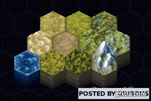 This is a set of lovingly hand-painted 2D terrain hex tiles suitable for an RPG overworld, a strategy game, or boardgame-like visuals.