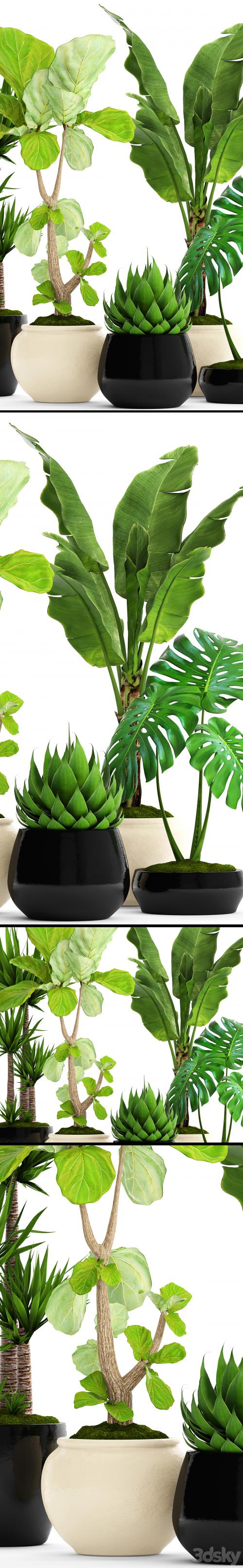 A collection of plants in pots. 45 The banana palm. Lyrate ficus. Agave. Yucca. Monster.