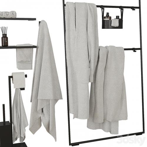 The set includes everything in the render: a bathrobe on a hanger, a bathrobe on a hook, folded towels, aluminum shelves, slippers, a bath towel on hooks, toilet paper, a toilet paper holder.