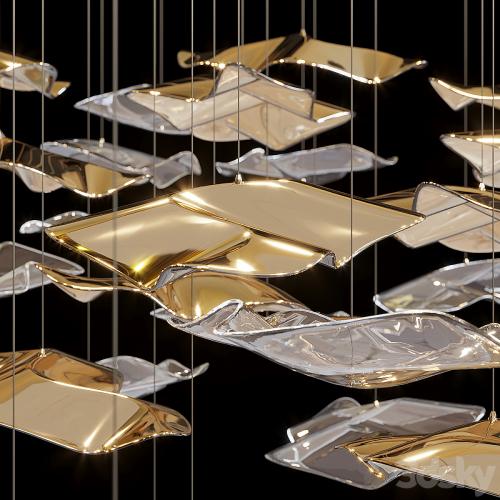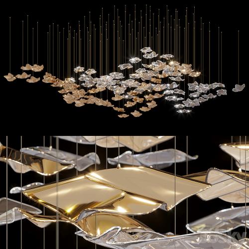 Clear crystal and moongold ripples are delicately suspended either from minimal ceiling plates or from custom fixings as the project specifics require.