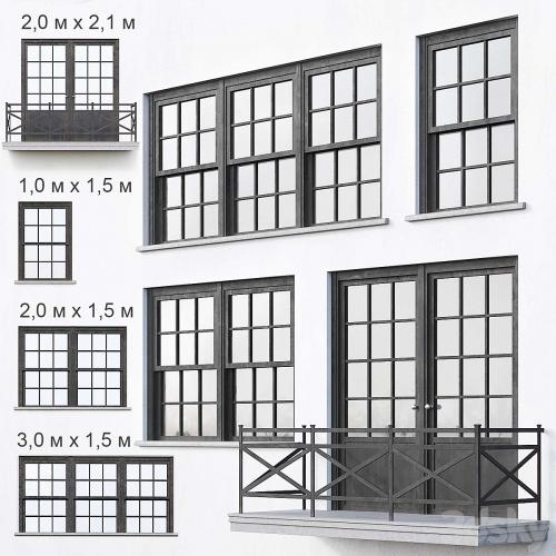 Loft style windows. Archived: single door window (1.0 x 1.5 m), double door (2.0 x 1.5 m), three-leaved (3.0 x 1.5 m), balcony door (2.0 x 2.1 m) with a balcony. The UVW Map stack is not collapsed. Materials in English. The model is light.