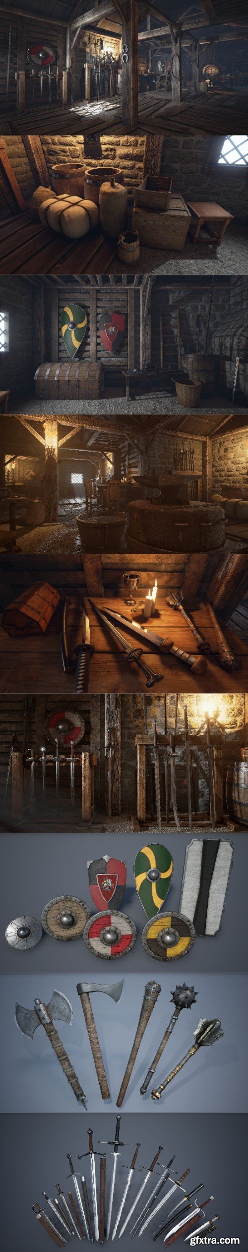 This scene takes place in armory of Medieval time period. It includes about 80 high quality props for interior, which could be used for adventure role playing or fantasy themed games.
