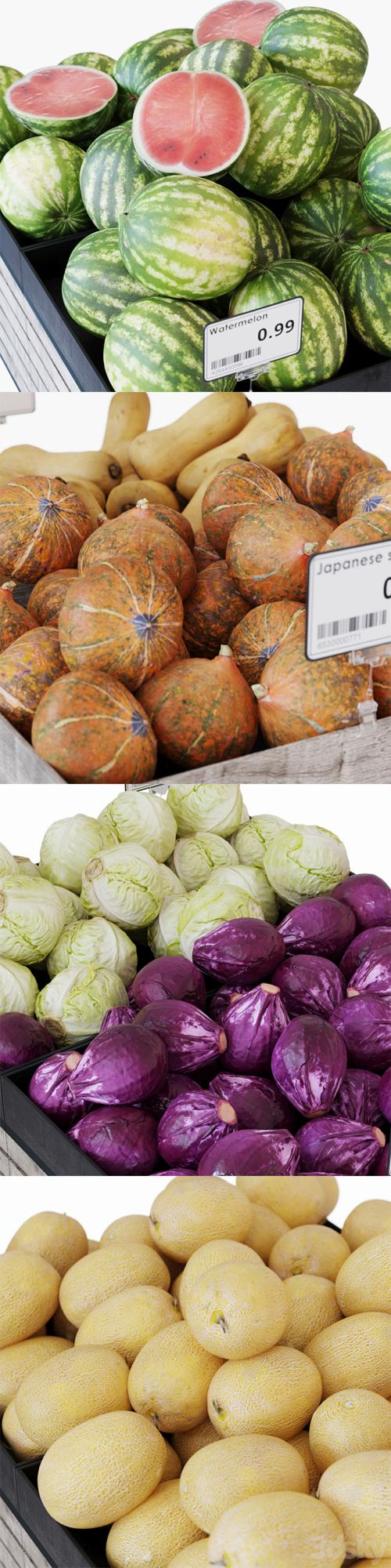 - 6 types of photorealistic vegetables / fruits / berries: watermelons, melons, pumpkin of two kinds, cabbage of two kinds + half a watermelon.