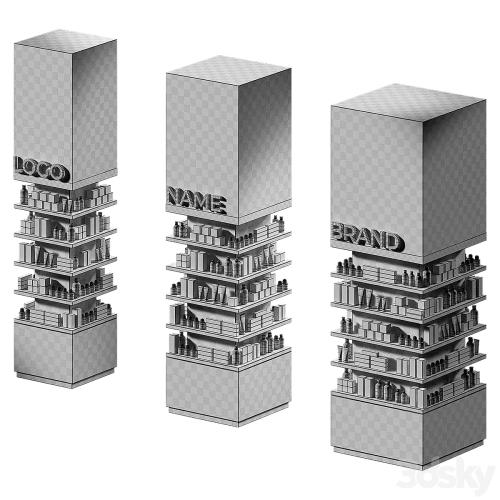 The 3D model contains columns with trade products. Finishing a column post in the form of a retail rack with lighting. An island in the form of a showcase for trade in a beauty salon, shopping center, pharmacy, pharmaceuticals, perfumery. Boxes, tubes, bottles, jars with cosmetics and medications in white packaging.