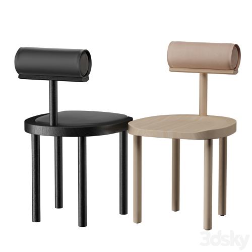 Dining chair in solid wood with leather upholstered seat and back bolster.
