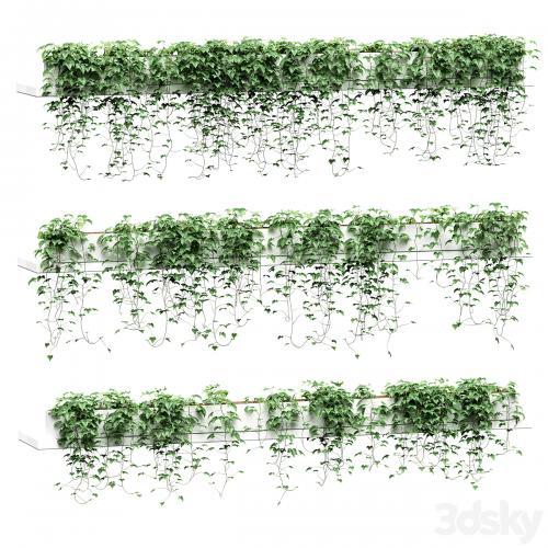 Hanging ivy in pots on long shelves. 3 models