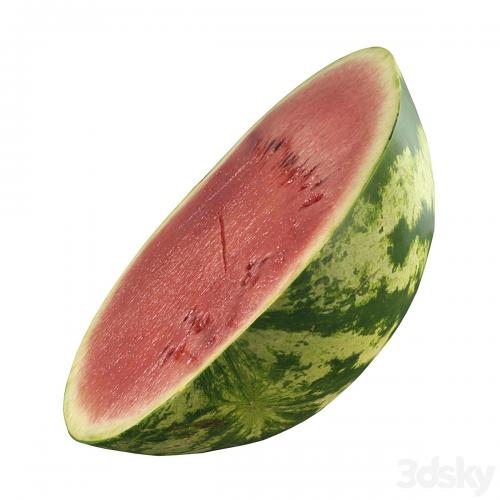 Highly detailed scanned model of a watermelon and its cut parts. Three objects: a whole watermelon, a cut half and a sector. Size ~38cm.