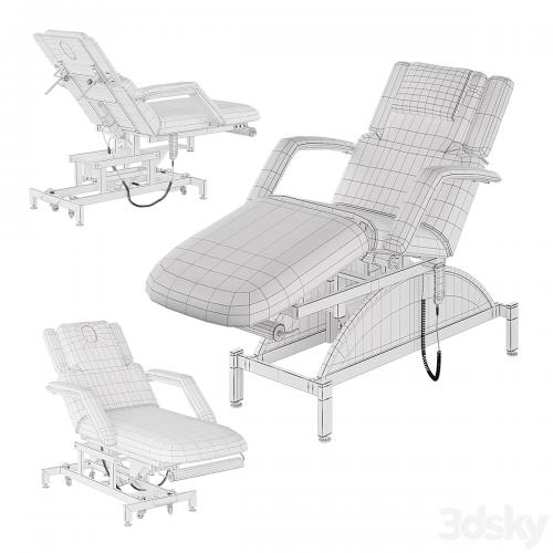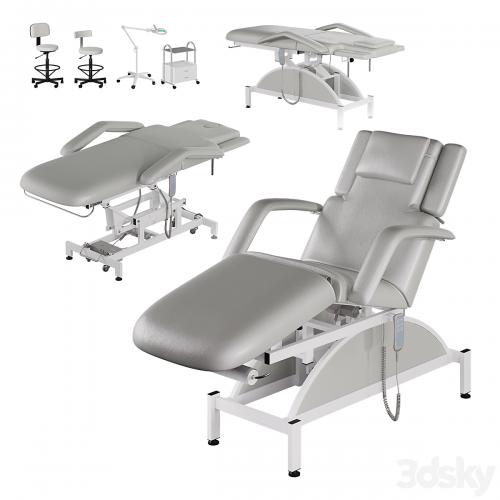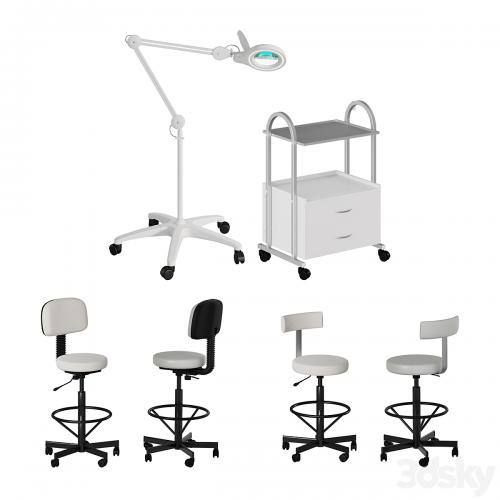The file contains models of massage couches of 2 types, a table, 2 master chairs, a magnifying lamp on a stand with wheels, 2 types of eco-leather upholstery.