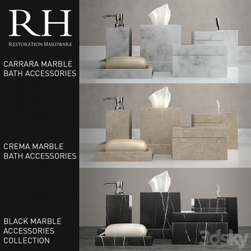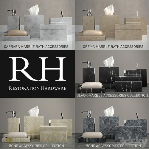 A scene from the five sets of bathrooms for Restoration Hardware. 1 CARRARA MARBLE BATH ACCESSORIES 2 CREMA MARBLE BATH ACCESSORIES 3 BLACK MARBLE ACCESSORIES COLLECTION 4 BONE ACCESSORIES COLLECTION 5 BONE ACCESSORIES COLLECTION Archival max2012 / max2010 / fbx / obj