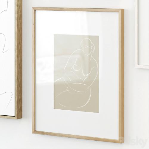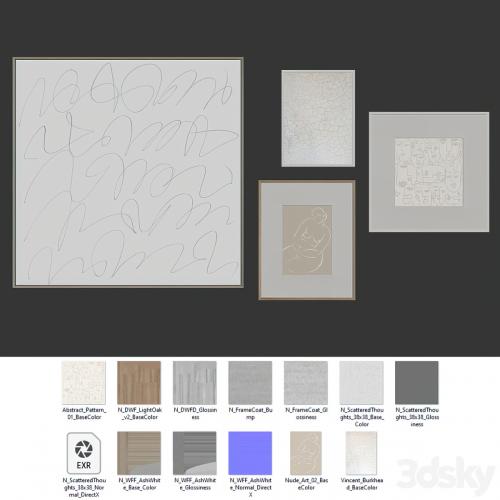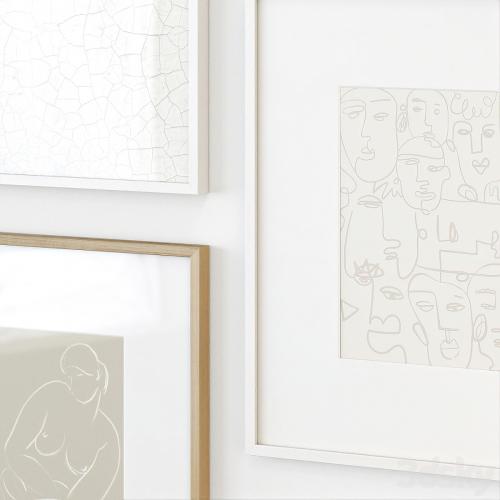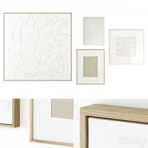 A set of abstract posters in light colors in wooden frames with a paintitng on canvas.
