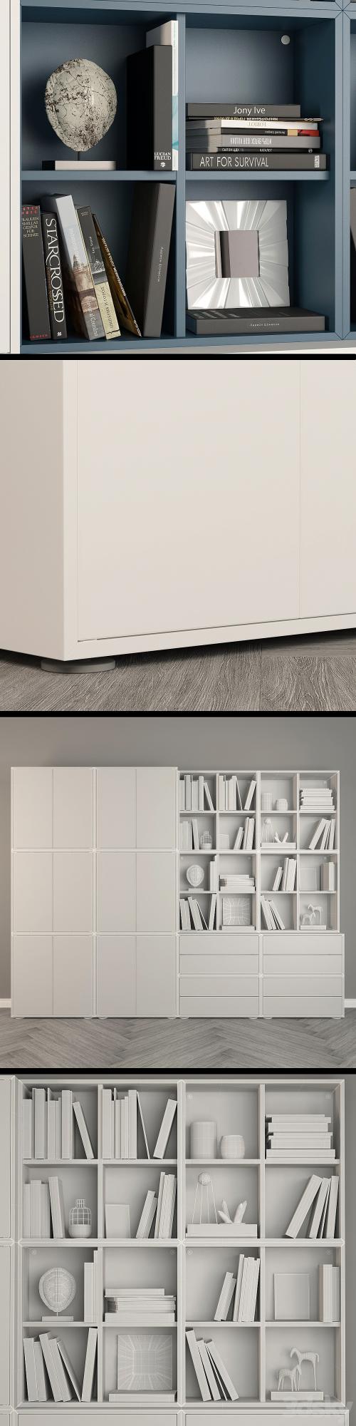 The combination of cabinets with adjustable legs in white / dark blue color (for the convenience of combining in the scene there are also cabinets in the colors light orange, orange, blue, light gray, dark gray, white).