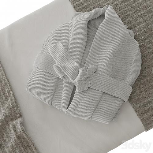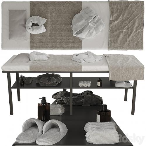 Massage table with decor: folded bathrobe, aroma diffuser, rolled towels, bath towel, towel.
