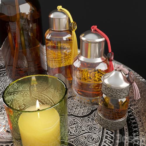 , for hammam, in hamam, decor, decorative, set, sets, kits, kit, Turkish, bath, baths, sauna, saunas, accessory, accessories, towel, towels, element, elements, tray with, bottles, bottle, container, containers, oil, oils, soap, soaps, jug, candle, candles, 3d, models
