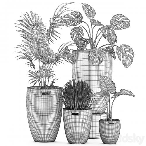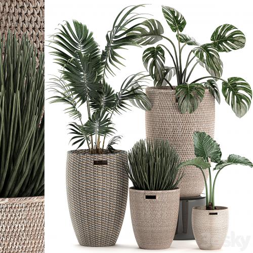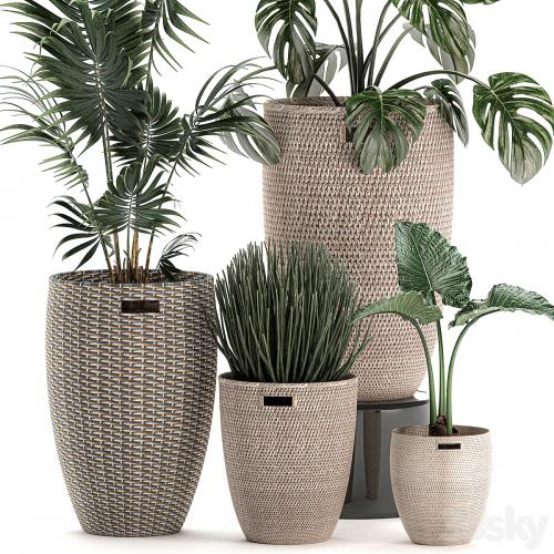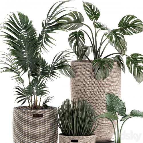 Collection of small plants in decorative baskets pots with Monstera, hovea, alokasia, palm. Set 570.