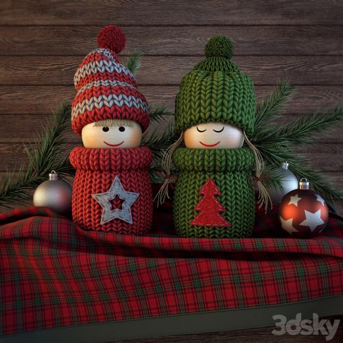 Christmas decorative set with dolls. At the present stage: two dolls, a tablecloth, a branch of spruce and balls. To render similar perspectives on the tablecloth and knit garments can be included turbosmooth. All happy!
