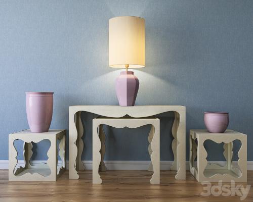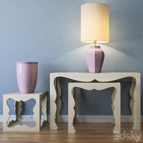 Included: 1. Savoy Bunching Cocktail Table 48,26 * 48,26 * 48,26 cm 2. Savoy End Table 50.80 * 66.04 * 63.50 cm 3. Savoy Console Table 121.92 * 40.64 * 76.20 cm 4. Marioni Season table lamp 5 . Marioni plant pots