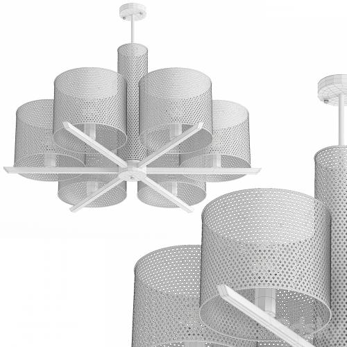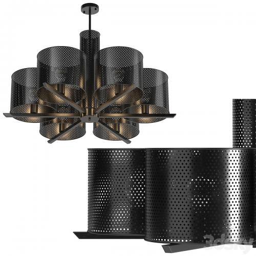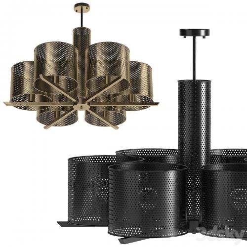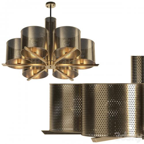 A contemporary 6-lamp Morrison chandelier blends rich antique brass, metallic finishes and bold geometric designs. Each lamp is adorned with industrial shades with small perforated holes for a soft light effect. Stylish look for modern interiors!
