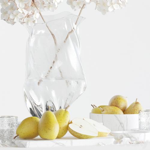 Decorative set with pears and hydrangea.