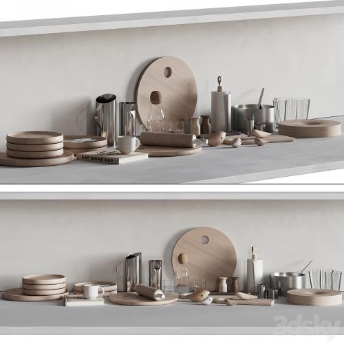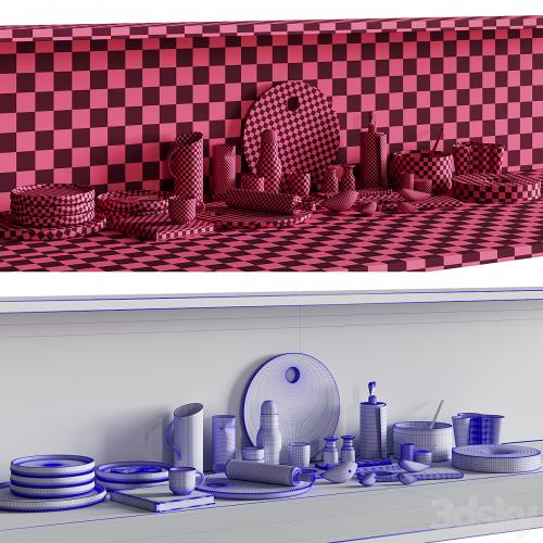 3d model of a decorative set of dishes and kitchen accessories. Suitable for placement on shelves, tables, bar counters, kitchen cabinets, etc.