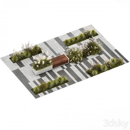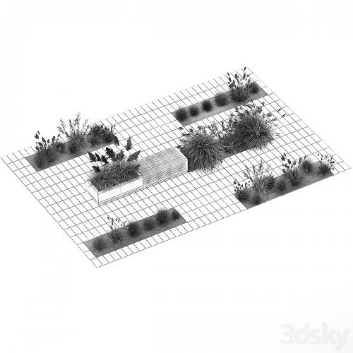 花床中有羽衣甘蓝灌木、芒草、矮雪菀和白色帕米拉草,有长凳及长凳铺地砖。1147.
