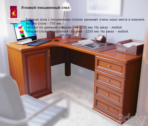 Corner desk from the company Kombat. Corner desk is made of: Material facades desk and wardrobe - an array of cherry (color - walnut) made in Italy; Table top desk can be done in three ways: Blockboard, MDF with wood veneer and lining, chipboard with wood veneer and lining. Hardware - metal, manufactured by BRASS (Spain); Full extension ball bearing slides (Italy). Installation of the cable channel and a sliding keyboard shelves. Site http://www.kombatt.ru/ Polygons much. Model without decoration.