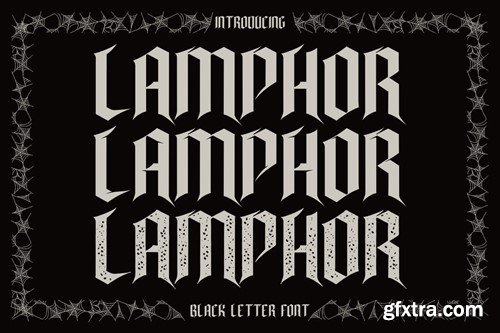 Lamphor - Black Letter Font Lamphor - Black Letter Font exudes an eerie and intimidating aura with its sharp and pointed letterforms. This font is perfect for gothic or horror-themed designs, making it an ideal choice for projects seeking a menacing vibe. It offers three distinct versions: regular, display, and texture, allowing for versatile use in various design contexts. Lamphor finds its niche in gothic themes, logos, posters, titles, headlines, as well as within the realms of heavy music genres like black metal and death metal. Whether it's album covers, music posters, or anything that requires a sinister touch, Lamphor fits the bill perfectly. In Package : Feature : Note : The preview mock-up, element, shadow, image or graphic stock is not included in the download file. It’s only for presentation purpose. Thank you