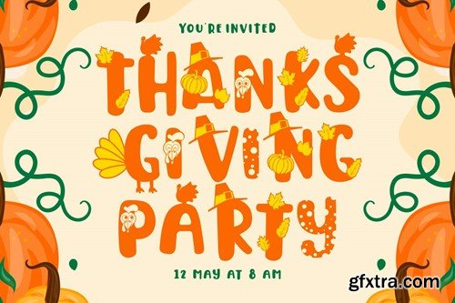 Thanksgiving Joy -Various Fun Font Thanksgiving Joy - Various Fun Font is a whimsical and playful typeface designed to celebrate the spirit of Thanksgiving. With its rounded and friendly characters, this font adds an element of fun and warmth to your designs, making it a perfect choice for projects related to this special holiday. This font boasts nine delightful decorative variations, each inspired by different Thanksgiving motifs like turkey, pumpkins, pie, leaves, and hats. It's an ideal font for creating Thanksgiving-themed designs, including invitation cards, birthday invites with a Thanksgiving theme, party decorations, logos, stickers, packaging, children's books, magazines, and more. With its charming and playful style, Thanksgiving Joy captures the essence of gratitude, celebration, and the joy of Thanksgiving, making it an ideal choice for any project that aims to bring the warmth of this holiday to life In Package : Feature : Note : The preview mock-up, element, shadow, image or graphic stock is not included in the download file. It’s only for presentation purpose. Thank you