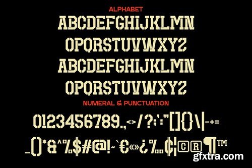 Introducing our new product Bandex - Stencil Typeface This font is characterized by its unique typography style, which features distinctive attributes, namely holes or "cutouts" present in each letter and symbol. The primary hallmark of stencil font is the presence of gaps or apertures around the edges of the characters. This font serves various purposes, particularly in designs that require a special appearance with a robust, assertive, and characteristic touch. It can be used to create messages that are easily recognizable and convey a strong impression in various design contexts. availlable