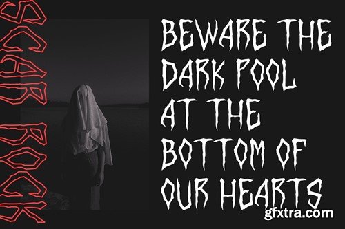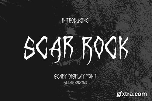 Scar Rock Scary Display Font Scar Rock scary display font. Heavy stroke, fun character with a bit of ligatures. To give you an extra creative work. Scar Rock scary display font support multilingual more than 100+ language. This font is good for logo design, Social media, Movie Titles, Books Titles, a short text even a long text letter and good for your secondary text font with script or serif. Make a stunning work with Scar Rock scary display font. What you get: Cheers, Maulana Creative