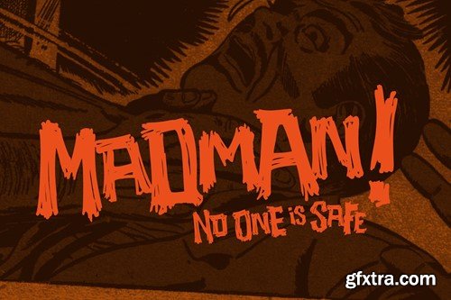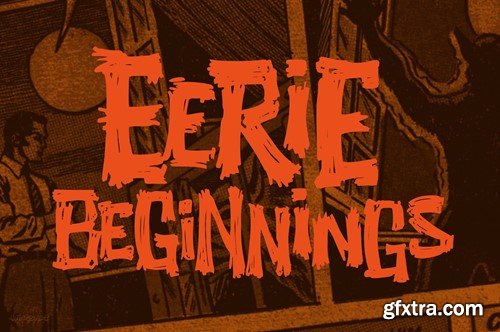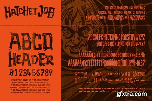 Unleashed onto an unsuspecting public this Halloween, Hatchet Job is a brush font inspired by the slasher and cabin-in-the-woods horror movies and comics typical of the 1970s and 80s. This textured all-caps design takes its visual style from old cabins, ghost ships and axe-splintered wood that can only spell danger! With a bold brush strokes and frayed edges, it offers the tools to leave your readers nerves in tatters! The Hatchet Job font family includes all-caps uppercase and lowercase characters, along with numerals, punctuation, symbols and language support. Also included are a complete set of alternative characters and additional paint marks, drips and splashes. Wingsart Studio Design Tip! The uppercase and lowercase characters work great when mixed in an alternating fashion, with shapes that combine to create a dynamic, un-hinged look that's perfect for the Halloween season. Add the alternatives and paint marks into the mix and you'll have yourself a title or header design that looks truly custom-made. Contents: Special thanks to the Digital Comic Museum for the background images used in these visuals. All artwork is in the public domain and used for visual purposes only.