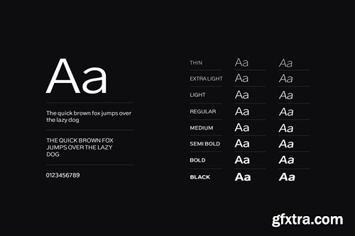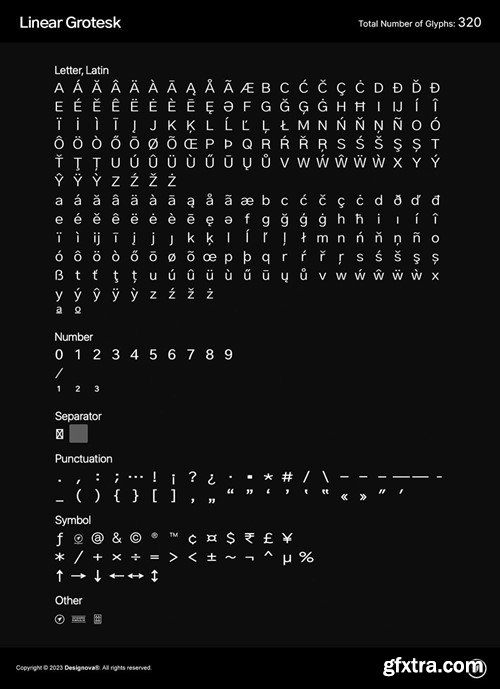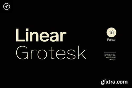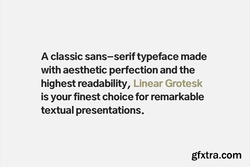 A classic sans-serif typeface made with aesthetic perfection and the highest readability, Linear Grotesk is your finest choice for remarkable textual presentations. Created with a special focus on perfection and simplicity in typography, this typeface can transform your design projects to another level of visual appeal. Linear Grotesk typeface family comes with a total of 16 fonts having 8 weights (Thin / ExtraLight / Light / Regular / Medium / SemiBold / Bold / Black) in upright along with Italic versions of all these weights. Handcrafted and designed with powerful OpenType features in mind, each weight includes extended language support including Western European & Central European sets. A total of 320 glyphs cover extra letters, symbols, punctuation, and marks. Linear Grotesk is a perfect choice for graphic design, text presentation, web design, print, and display use. The typeface can be an amazing option for beautiful branding, logo/logotype design projects, marketing graphics, banners, posters, signage, corporate identities as well as editorial design. Adding extra letter-spacing for the upright capital letters will make this font perfect for minimal headlines and logotypes as shown in promo images here. The pack contains OTF, TTF, and Web Fonts (all EOT, SVG, WOFF included). HTML & CSS WebFont preset & demo are Included in the download pack. --- CREDITS: Typeface designed & distributed by Designova®, made with ♥ in Berlin.