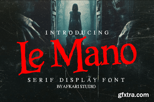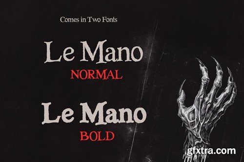 Le Mano - Unique Serif Display Font "Le Mano" is a captivating serif display font that seamlessly blends classic elegance with modern sophistication. Crafted with precision, its graceful strokes and refined serifs exude a sense of timeless charm, making it a versatile choice for various design projects. This font commands attention with its distinctive and carefully balanced letterforms, each meticulously designed to offer a harmonious flow and readability. The deliberate spacing and clean lines ensure clarity, even at larger sizes, while maintaining a graceful presence in smaller text. Features: Format File: Utilizing this font for titles, headings, or focal points within a design can create a unique juxtaposition that captures attention and adds a touch of sophistication to the fun and spooky theme. If you're looking to insert "Le Mano" into your designs for these themes, consider experimenting with its application in headlines, titles, or accent text, horor theme, horor font, leveraging its elegant yet slightly haunting aesthetic to amplify the overall feel of the design.
