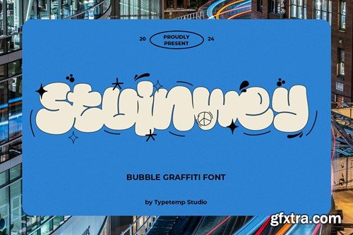 Stuinwey - Bubble Graffiti Display a font with Graffity Bubble Style. Comes with alternatives and ligatures, helps to create stunning Posters, Branding, Tshirt, Social Media Graphics and much more. WHAT'S YOU GET ? to use Alternates and Ligatures you need a Program supports OpenType features such as Adobe Illustrator CS, Adobe Photoshop CC, Adobe Indesign and Corel Draw. I really hope you'll get pleasure using Stuinwey font and it will be perfect addition to your font collection! Contact me with an inbox message If you have any question. Thank you! Happy Creating.