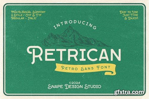 Retrican, a retro sans serif font, merges vintage charm with contemporary appeal. With clean lines and subtle nods to mid-century design, it infuses projects with a sense of nostalgia and modern sophistication. Ideal for those seeking to evoke retro vibes with a fresh twist. FEATURES : Uppercase, Lowercase, Number, Punctuation, Multilingual FAMILY FONT : Regular, Italic FILES INCLUDED : OTF File TTF File